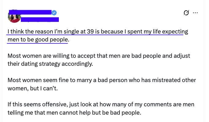 I think the reason I'm single at 39 is because I spent my life expecting men to be good people. (www.forums.red)
