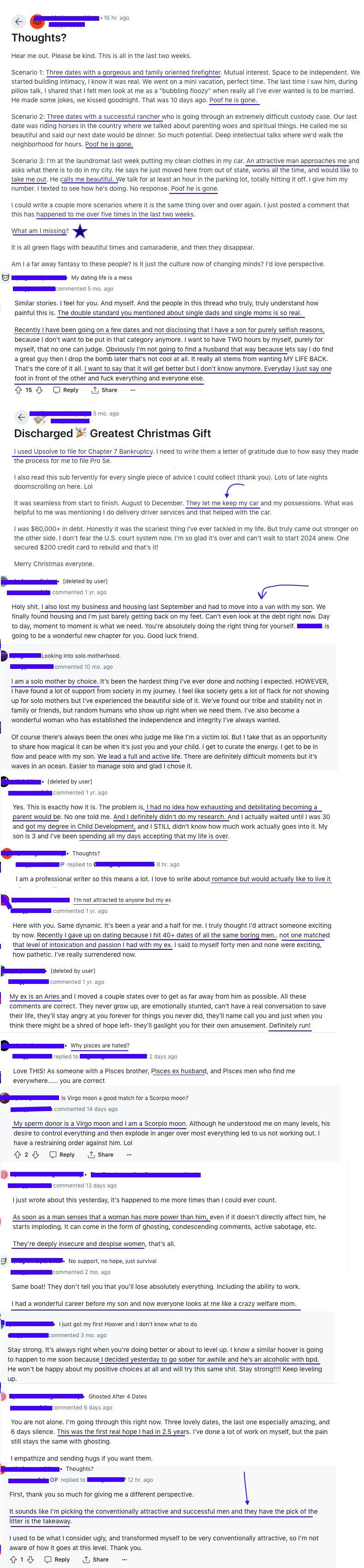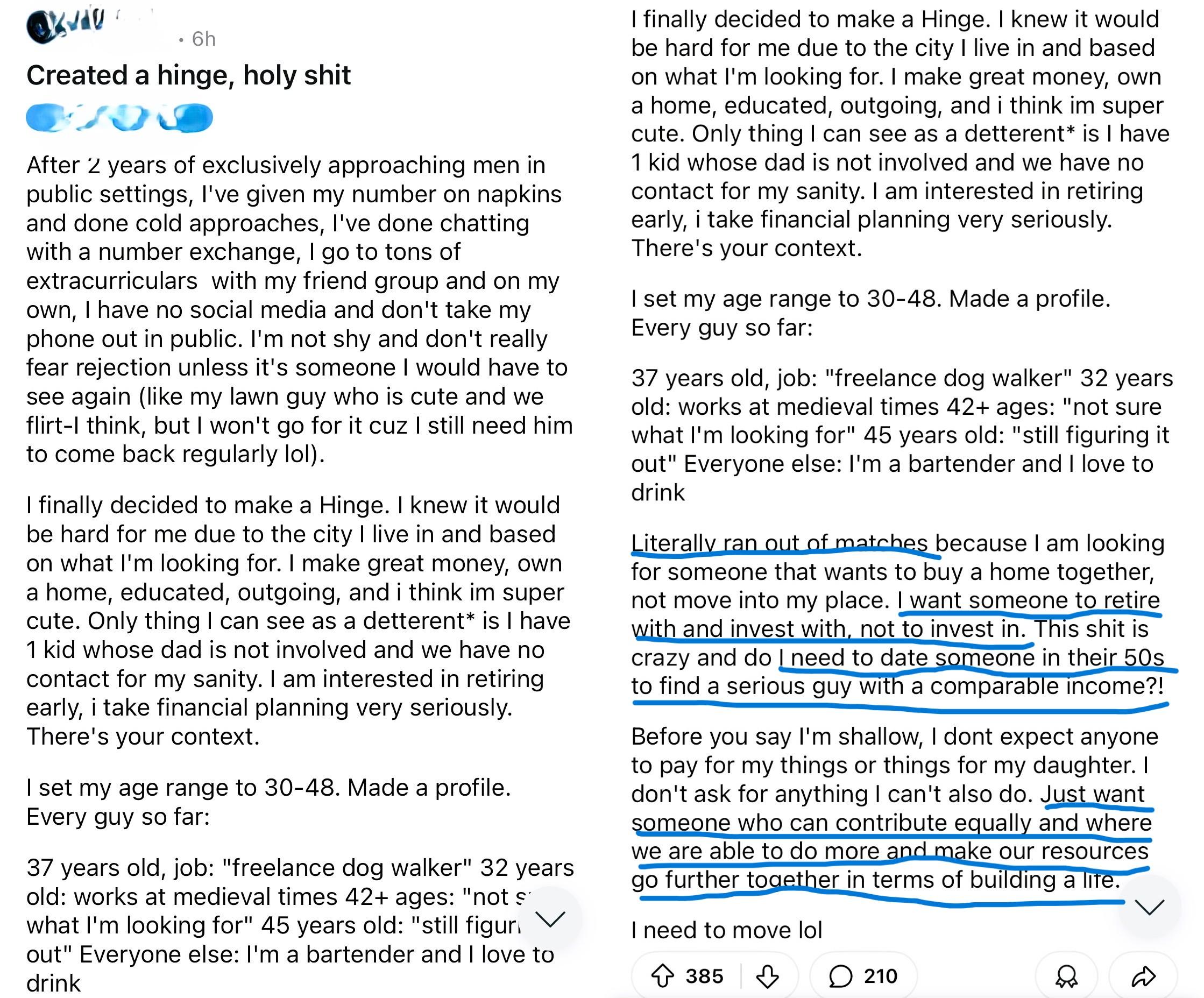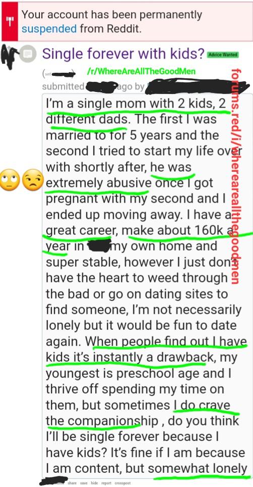 The manosphere has been screaming this for years: Men don't give a fuck about her socioeconomic standing. The kind of man she wants all the other women also want, so he can afford to date the ones younger than her and without kids. She's in her 30s and with a kid, She needs to get real. (www.forums.red)