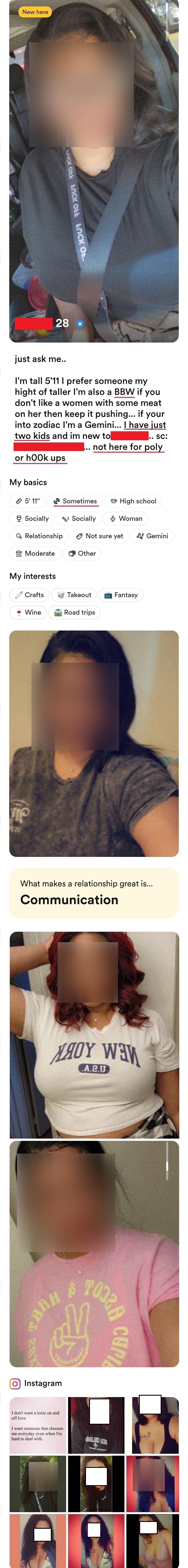 6. No personal information in dating profiles or social media accounts. Take a screenshot and censor all names, social media, hometown, school, and place of work. Additionally, censor any children's faces if their mommy included them in any profile photos.