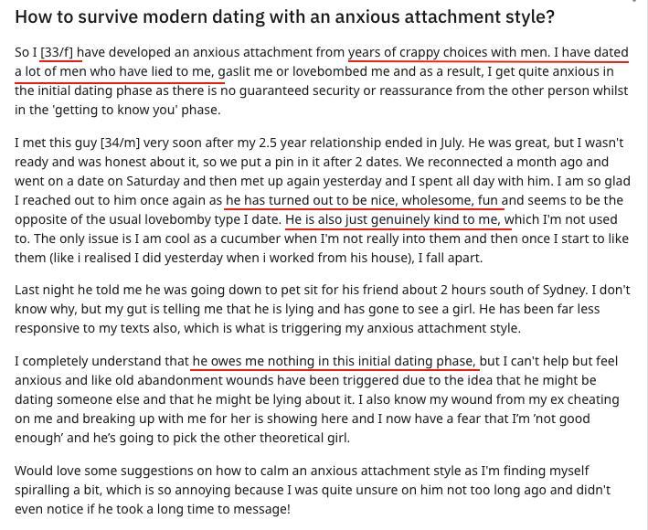 "I only desire men that treat me like a worthless piece of shit. If I meet a man that treats me well, I tag him as low value and do not desire him. It's the ill treatment that gets me excited. This is leading to poor outcomes, but I am unable to break the cycle because that would require honest self reflection."