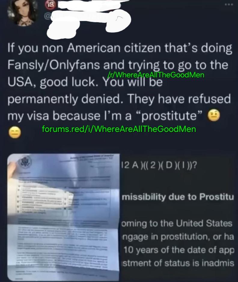 Like, for instance, if she'd bragged on social media that she was going to go meet up with her hooker friends in the US and go hooking all over the place, complete with links to her OF... yeah, it's possible that might have raised a few suspicions. Increasingly, visa officers are checking people's social media; Israeli immigration officials have been doing that for years to see if you're friends with anyone displaying prominent "DEATH TO ISRAEL/HITLER WAS RIGHT" stuff.