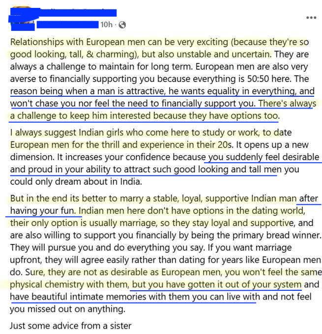 On the other hand, I've known lots of Indian women and never met one good wife among them. They are brutal, controlling, offensive, and yell a lot (behind closed doors).