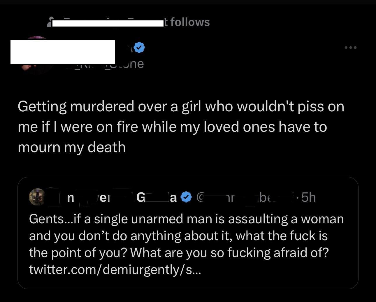 And for all we know it's a DV situation and the second we intervene, both of them will turn on a man trying to "save" the woman.