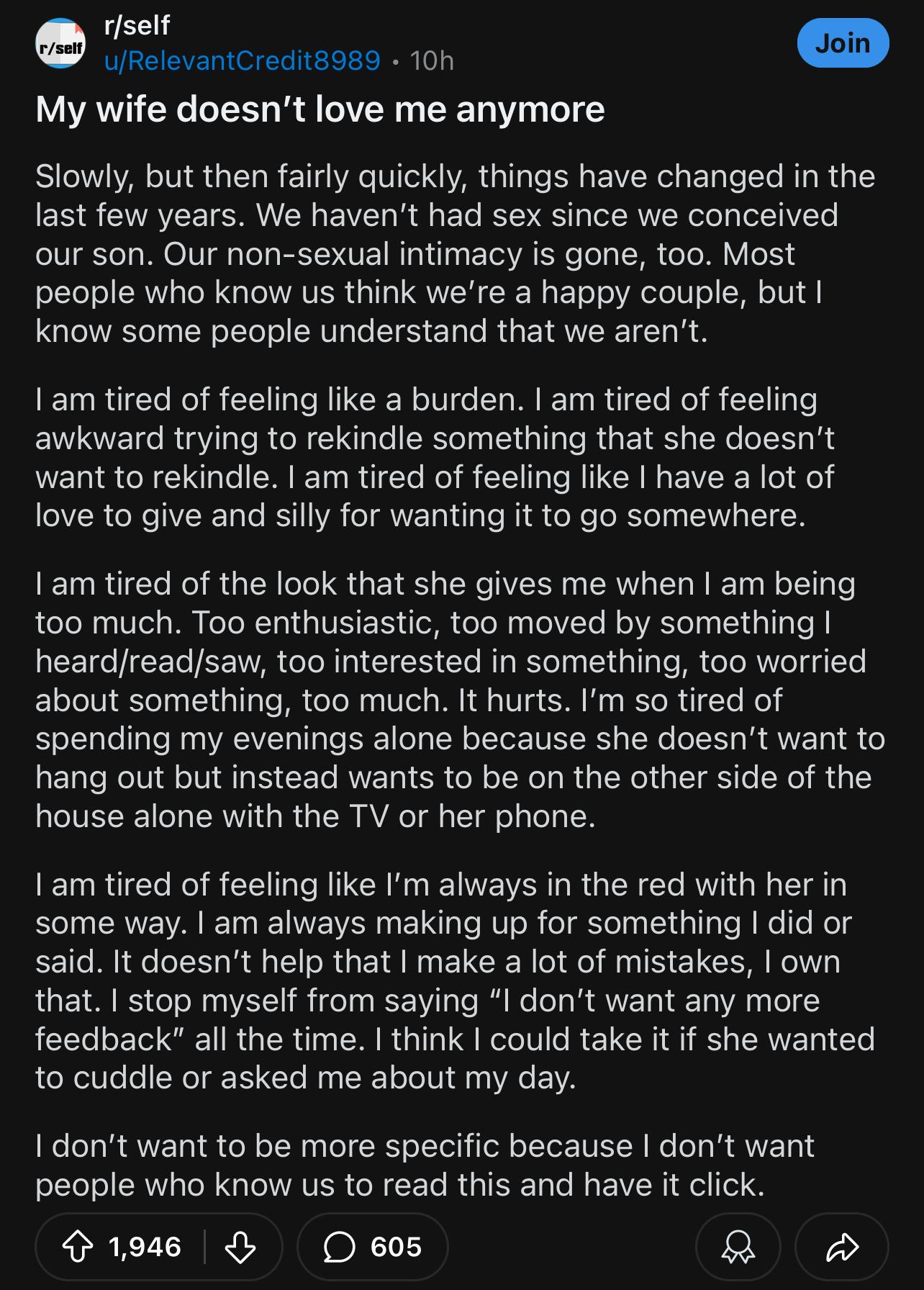 it's easy to say "well he should have just seen the red flags and not been such a beta" but society conditions men to be like this, and its a very difficult conditioning to break unless you're one of the lucky few who grew up with better influences.