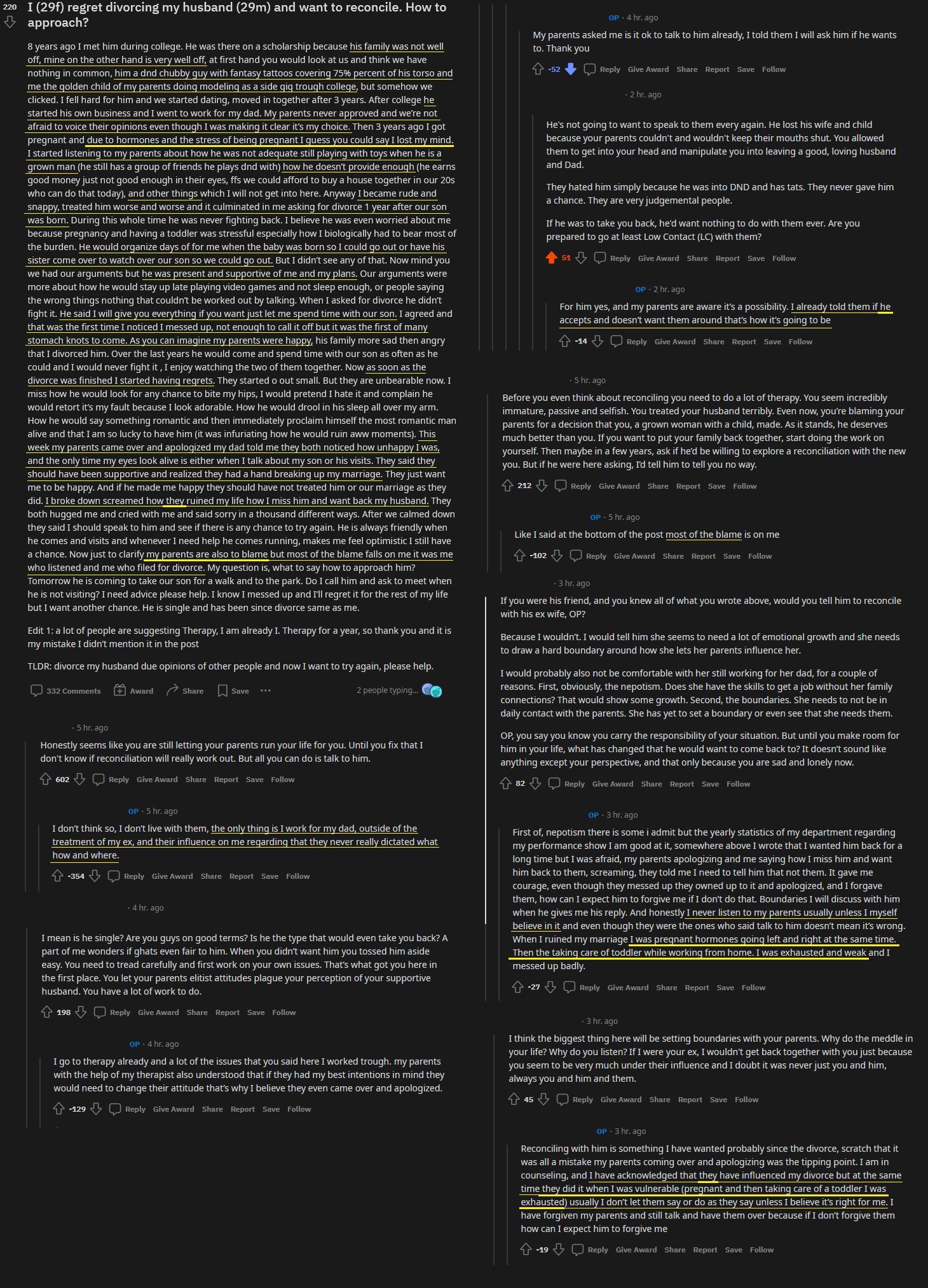 She never developed her own personality, her own sense of right and wrong, her own limits; even now, after all that happened, she isn't a full grown adult. Even if her parents were absolutely against the marriage, she could have bitten the bullet and eloped. Instead, working in the family business was more important than prioritising her new family - maybe the money was good, maybe daddy was still paying for her credit cards, who knows. But she never drew boundaries, and I hardly think she will now - all that changed is that her parents realised they messed up. And still, only after they gave her permission to regret the divorce she admitted her regrets.