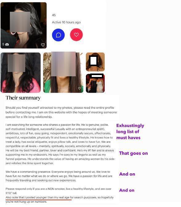 I didn't even read all of the profile, the pics were enough. I gave that a hard pass before her laundry list was factored in.