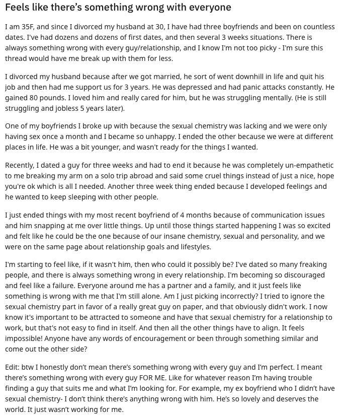 Great example of solipsism. What does she expect to get as a 35yr old divorcee? When I was in that age range I was married to a hot, young Asian and making babies while being treated like a King. I was purposely avoiding women like her. She wouldn't even show up in my dating apps because of her age. She should feel lucky to find any man at this point.