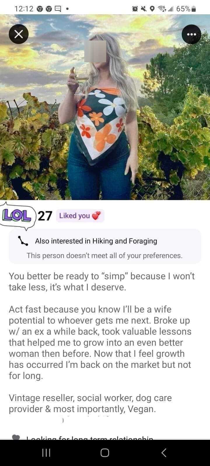27 y.o. and wanting a simp - but not one of the many on her friendzone. The only thing that has grown in her life the last few years is her circumference.