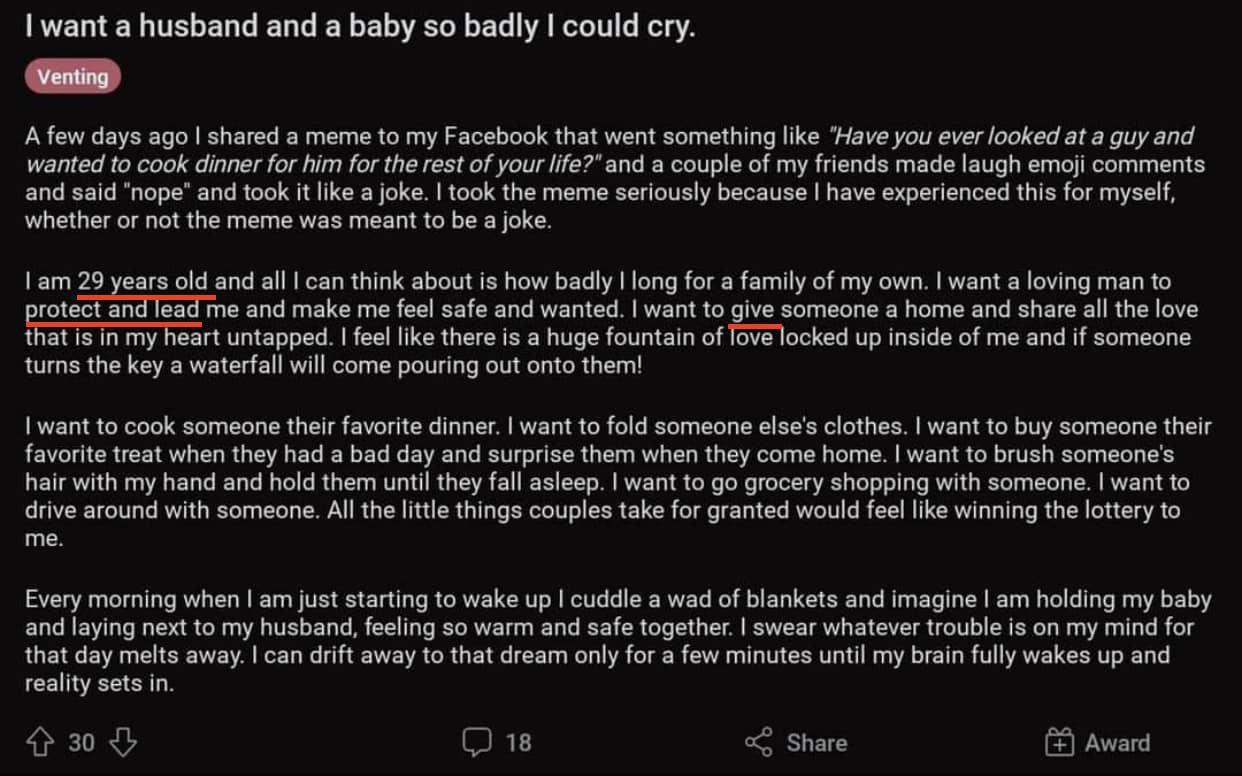 For some odd reason a lot of post 27-year-old women discover the allure of tradwifery. It's almost like an... Epiphany.