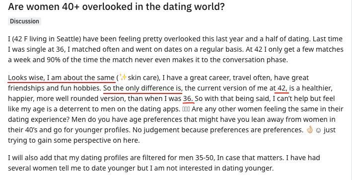42 and is asking why the guys in her age filter (35-50) don’t want her? 35? Even 50 is too young honestly, she should shift over to 50-99. She’s being greedy trying to pull a 7 year younger man for commitment when she couldn’t manage to lock a 35 year old 25 years ago