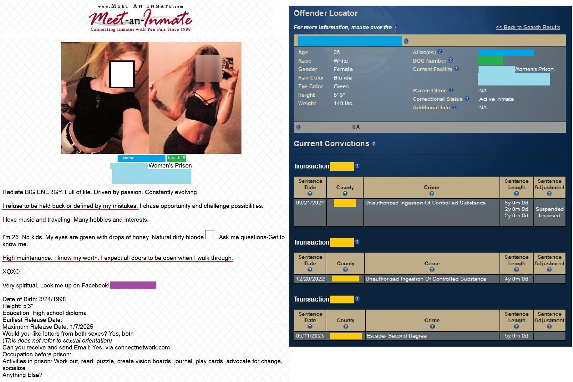 At first I thought, "Nothing too far out and crazy. Maybe a little crazy and a red flag with declaring herself 'high maintentance.'" And then I saw the header of "Meet an Inmate." First, never thought such a place existed, but now I have been made aware. And that puts more of the issues into a far worse context.