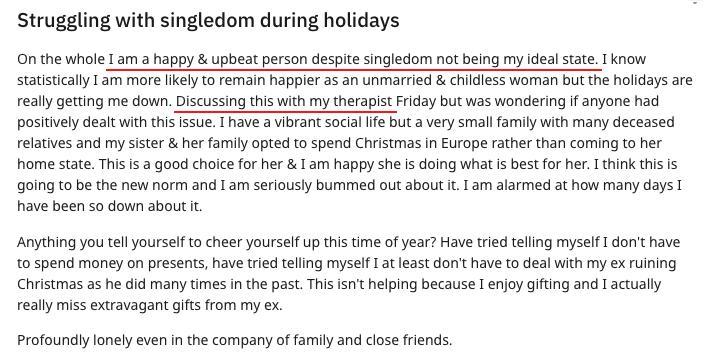 The whole "women are happier single and alone" thing is just massive copium that rears its head around the holidays. TikTok is full of this bullshit narrative.