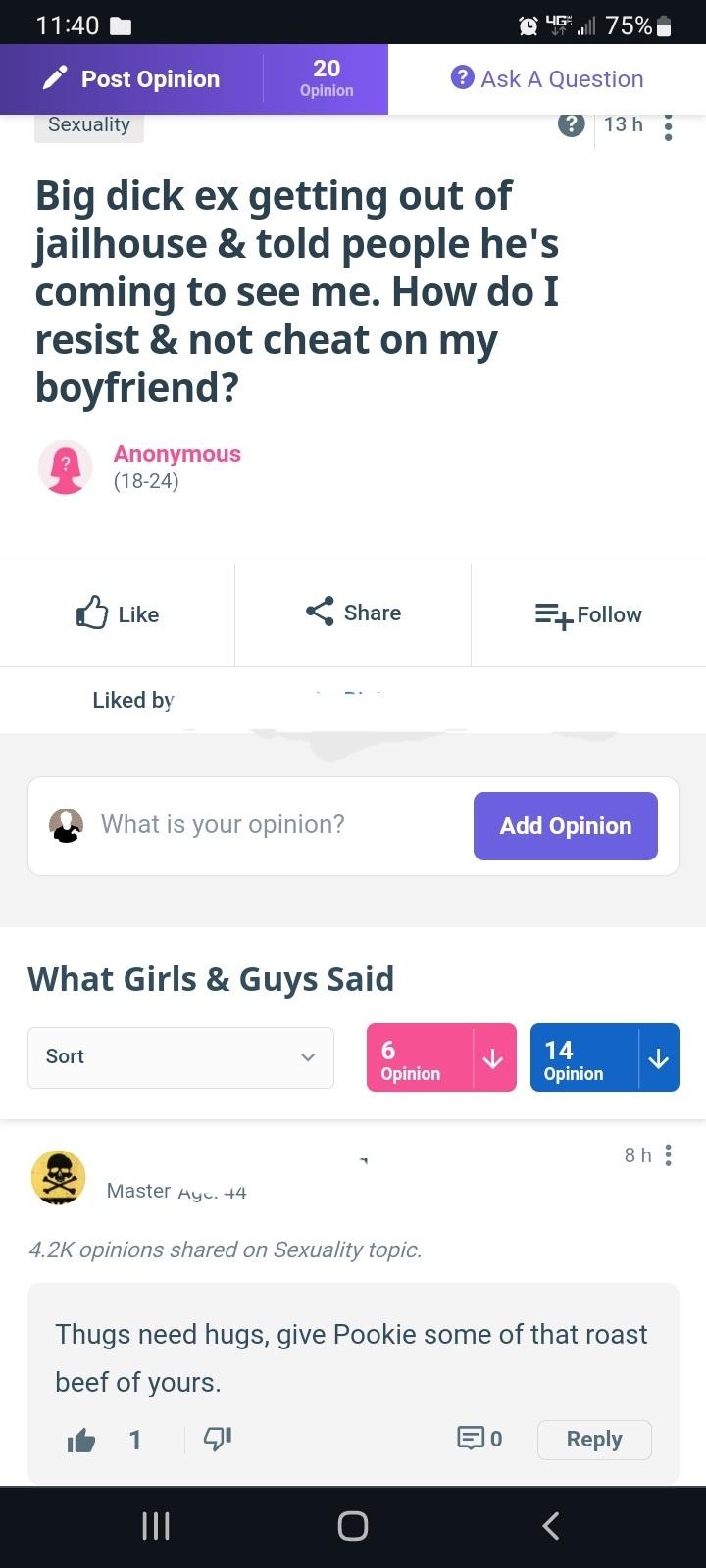 10 years ago now I started dating a girl at my work and a month or two in she told me her ex boyfriend is getting out of jail after many years. Lo and behold the day he got out he went straight to her house and insisted on seeing her, and “it wasn’t her fault but it just happened he was so persistent”. Luckily I really didn’t care about her, at all.