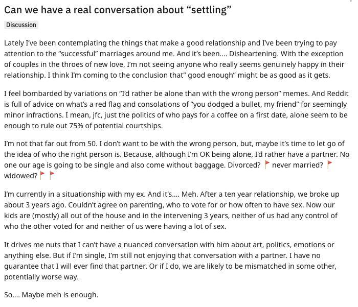 Posting under weekend content: @Typo-MAGAshiv "She is just having an epiphany phase this late in life and is still unwilling to "settle". The idea of "deserving the best", without the proper context (if you put in the work) is indeed a nefarious one. If you can post a comment along with the post and cover it along these lines, you are welcome to post it this weekend."