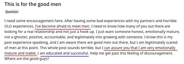 • 5. Submissions must show a woman who is looking for commitment while also either complaining about jerks or promiscuity, needing her kids provided for, being entitled or unreasonable, or complaining that she "can't find a decent guy". (Examples, details)