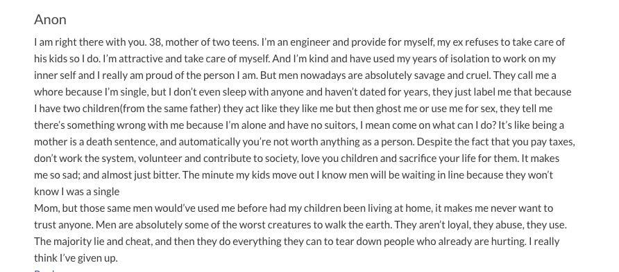 What she doesn't realize is that men know a single mom will always be a single mom. It doesn't matter if her kids are teenagers or grown and gone. One little pandemic, or if they get laid off of work, or they break up with their partner, first place they go is back to single mom. She'll let them move in, bring all their problems with them, and she's right back where she started umpteen years ago. Men don't want to deal with that shit.
