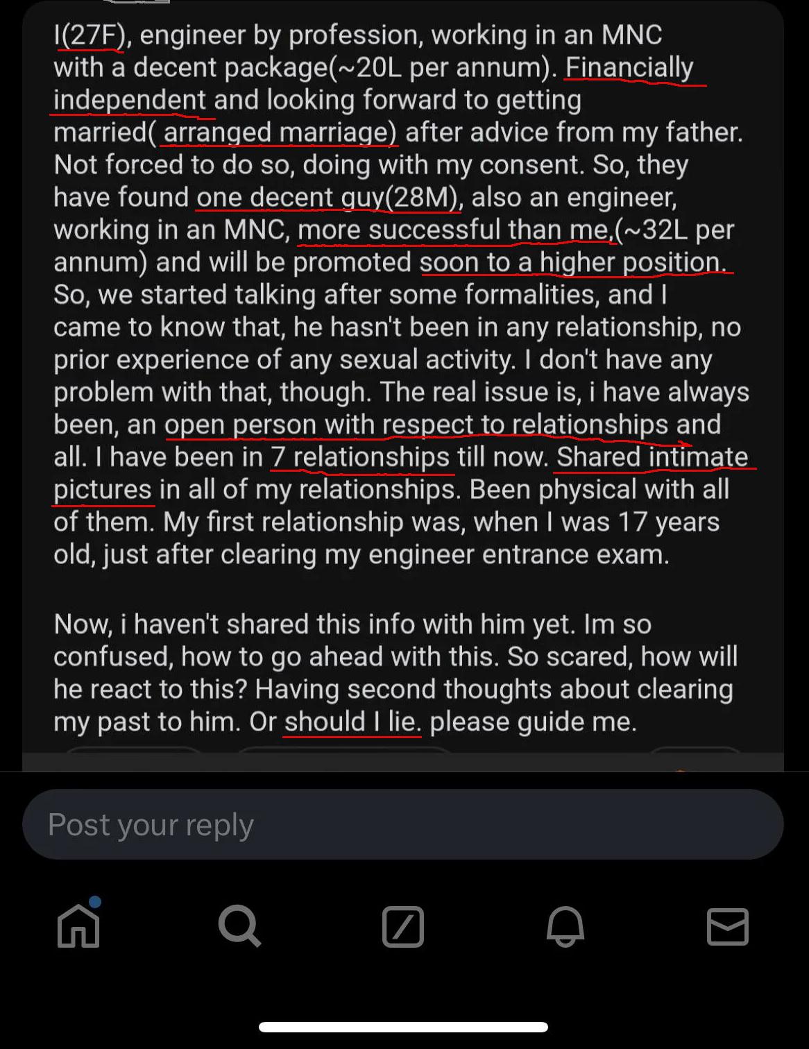 As to the lying, you have to remember that it's just not that big a deal to women (and interestingly, to Indians, culturally) as long as she gets what she wants - validation, attention, and status among women. She has hit a brick wall in this respect and can go no further without a family to rule over, like the other women in her cohort. After marriage, the mark of status will then be how much of a slave she can manipulate her husband into being. I've seen so many dogged, exhausted Indian husbands trying to just "do their duty" and it's sad. Not only are they expected to provide for their extended family (parents on both sides) but if they make enough it's common to support their whole village - and if you make a lot generosity is demanded of whoever asks you (or else).