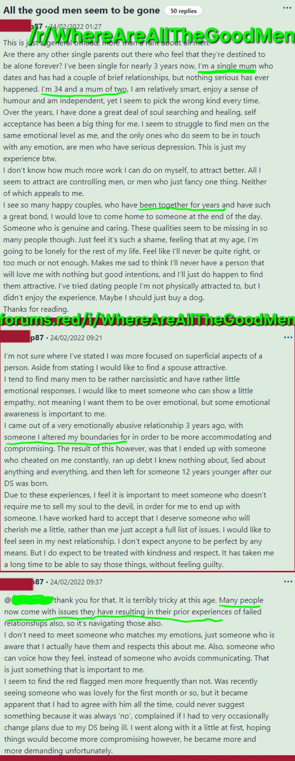 5. Submissions must show a woman who is looking for commitment while also either complaining about jerks or promiscuity, needing her kids provided for, being entitled or unreasonable, or complaining that she "can't find a decent guy". (Examples, details)