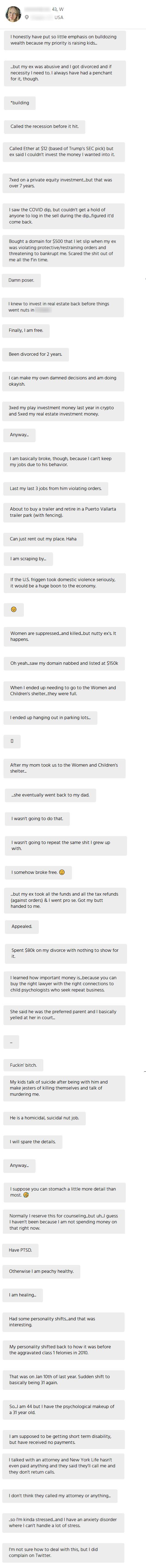 I’d almost wager that her ex-husband is a saint who made the mistake of trying to “fix” her, and his “abuse” is him trying to prevent her from forcing the family into bankruptcy and protecting his child from a delusional psychopath.