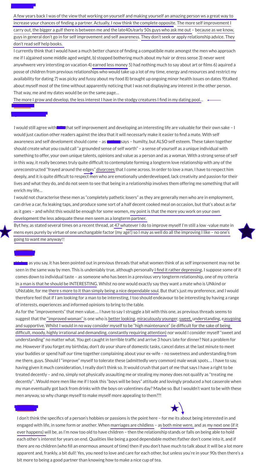 It's amusing to read their comment threads because they often make some interesting points such as that once a woman reaches her 50's, it's likely that she's going to "die alone" anyway in that any man she wants to marry, at least her age, is probably going to die in about 2 decades or so and she'll be dying alone anyway so what's the point?