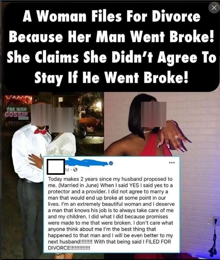 Regarding this woman divorcing her "broke" husband: That's the perfect time for HIM to get a divorce. Did you read that Donald Trump Jr was divorced by his wife because, I don't make this up, she said he was a "cheapskate?" I can just hear the alimony hearing now: "Er, your honor, the lifestyle to which I've become accustomed is that he's a cheapskate." Now Kevin Costner's wife on the other hand...