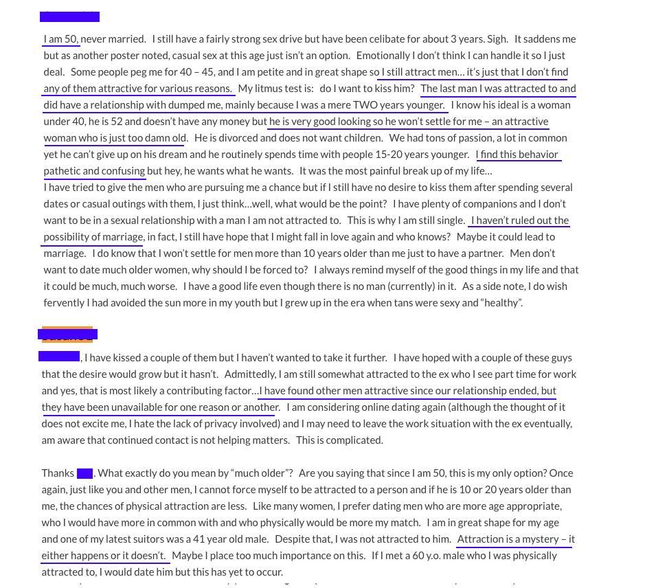 The fact is, she’s single and childless, which pretty much destines her to die alone. The fact that even a man just 10 years older gives her the ick means that she really has nothing to look forward to except death. At 50, I assume her parents are getting up there in age, for example.