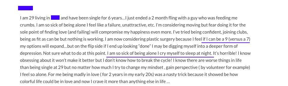 It would be interesting to know how she acted at the age of 21? Did she only want attention from the top 20% of men? Did she have a thing for bad bois, thugs and criminals? Now, at 29, Boo Hoo WAATGM? I have seen, in my lifetime, 3 women throw their lives away chasing unicorns. Average men were not good enough for them. Now, in their 30's they are passed over by the men they rejected years earlier. These women, in their 30's, lost their advantages of youth and fertility.