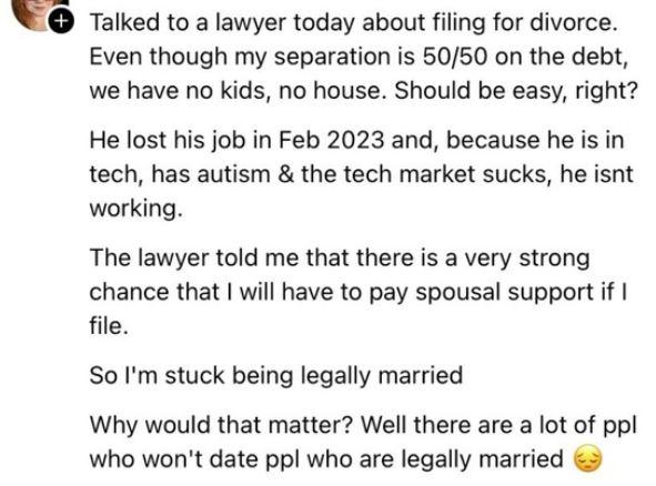 She basically dodged a bullet. She has no idea how bad her options will be in the dating market. She was already so bad she had to get a naive autistic guy to marry her.