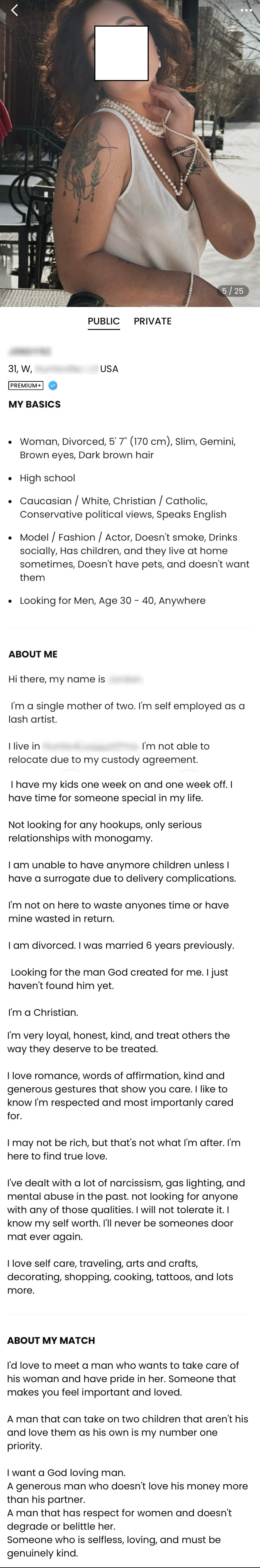 6. No personal information in dating profiles or social media accounts. Take a screenshot and censor all names, social media, hometown, school, and place of work. Additionally, censor any children's faces if their mommy included them in any profile photos.