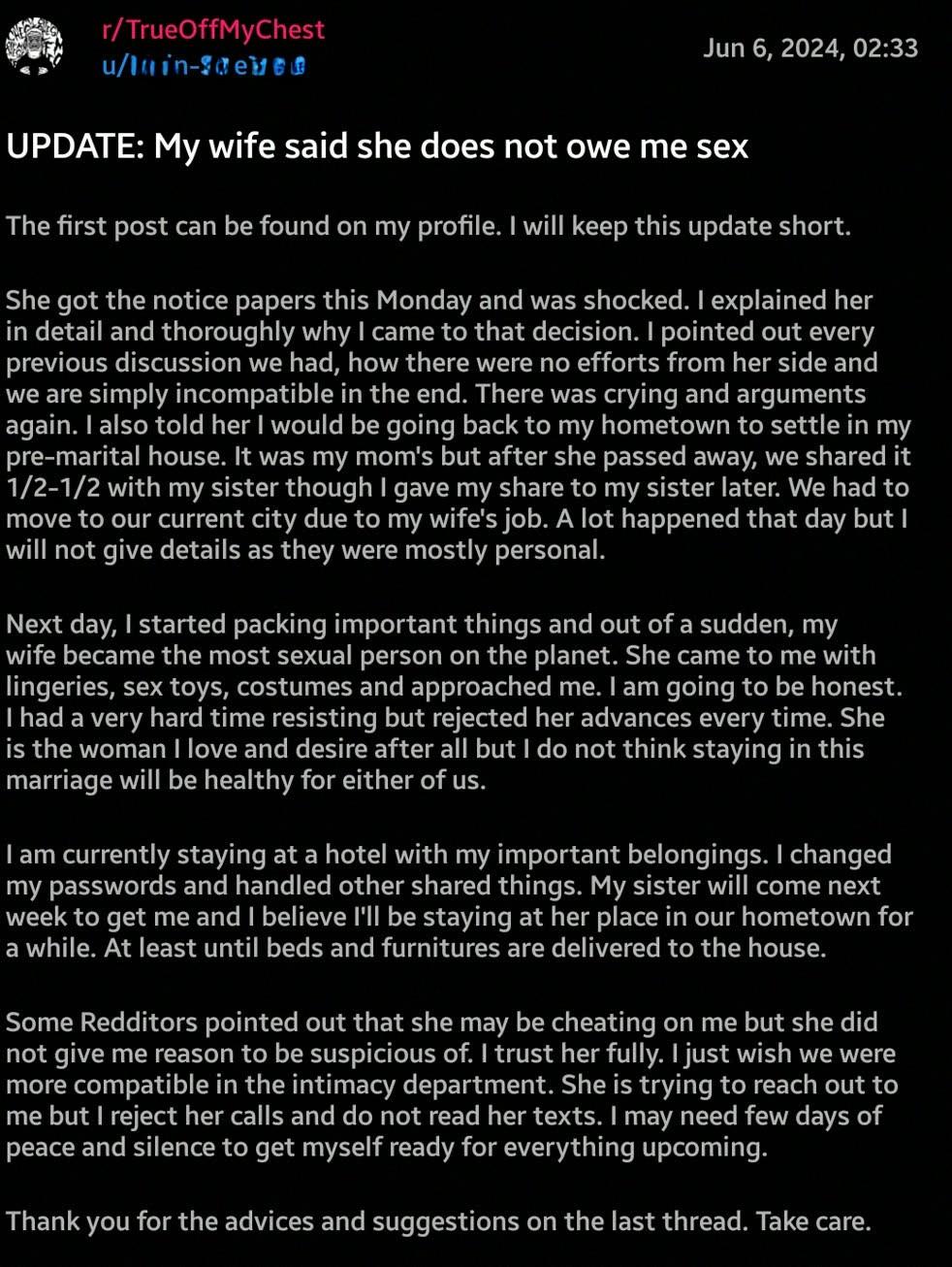 Nobody owes sex to others (unless one is a prostitute I guess), but each person in a personal relationship owes his/her partner the openness to intimacy, however that looks to them. If you treat sex or physical intimacy in general as a bothersome or repulsive ordeal, you're neglecting the very real human aspects of physical intimacy and connection. Sounds like his wife was withholding and didn't think he'd have the balls to demand more in his life.