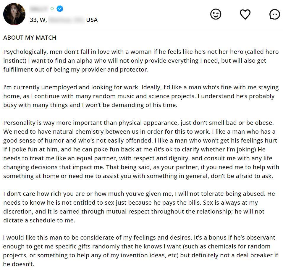Classic. Starts with "I want to find an alpha ... being my provider and protector". Seconds later: "He needs to treat me like an equal partner".