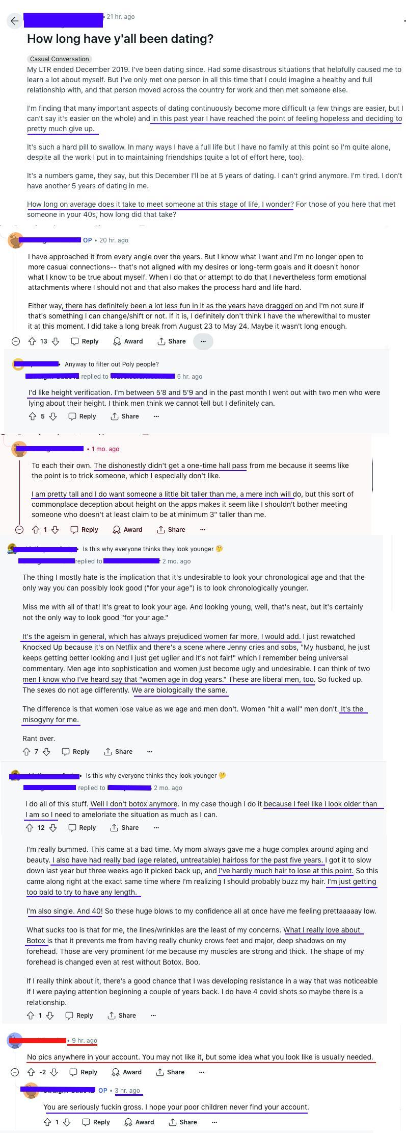 What's she's objecting to is the "misogynist" notion that, as women age, they become EQUAL to men and she loses her ability to make one-sided demands. Even in her present condition, dating online for a woman such as herself is far easier than for the average man.
