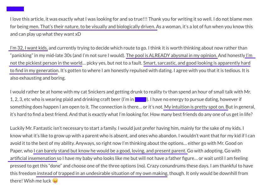 The reason women end up here is because their behavior is not exposed as the lucid, self-destructive, feminist ideology that it is. And we're here to help Good Men guard their commitment and resources by exposing women who would make poor life partners and mothers of their children. Providing observations and opinions on the posts here allows us to better understand women's psyche and later depressive/miserable state when they are not held to a moral standard required for healthy, functioning relationships.