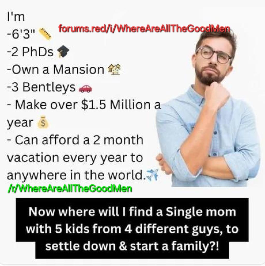 In response to r/niceguys, this forum is dedicated to exposing all the women who complain about wanting a "good man" after dating jerks and riding the cock carousel in the prime of their youth, and think they're deserving of commitment and financial stability when all they have left to offer is their depreciating looks, narcissistic mentality, used-up vaginas, and another man's kids.