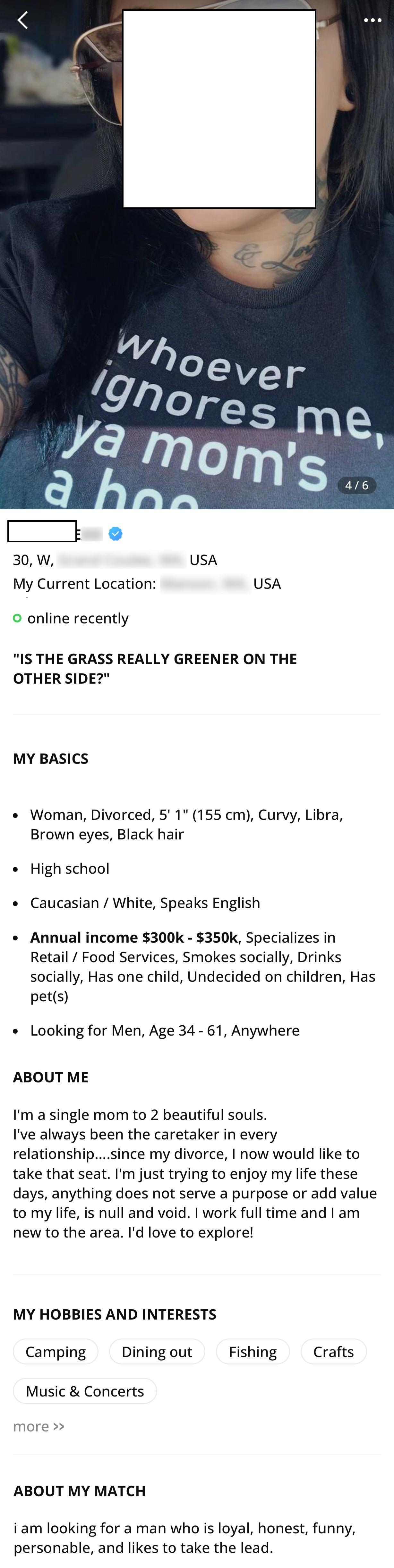 My guess is she got a split of some poor guy's business or is getting a fuckload of support/alimony so she counts that as income. Even if she is making that kind of money (highly unlikely), since women like dating up, who the fuck is making more than a quarter million in a year that would choose HER?