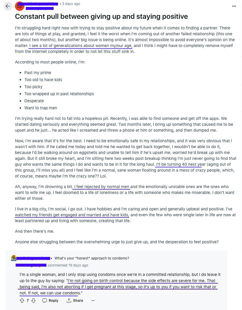 Again, that shit might fly if you're a hot 25 year old with a gaggle of men doing whatever they can to get in your pants. But when you're pushing 40, it's the other way around. Guys want you to cut out all of the bullshit drama in your life, or at the very least, deal with that stuff by talking to your girlfriends or whatever, and bring peace and calmness and tranquility to the relationship, or else they'll go find someone else. And guess what? That deal will only get even more one-sided as time goes on (unless you're willing to drastically lower your standards, which of course she won't do because she's a total catch because she checks notes has hobbies...)