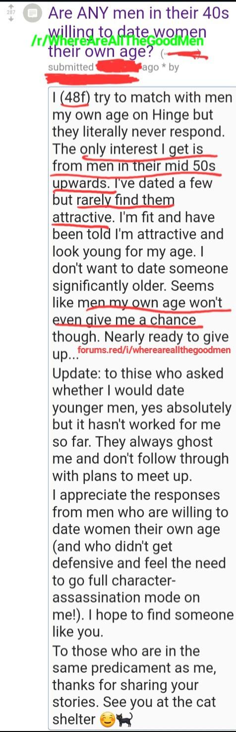 What she doesn't realize is that men her age set their dating app age filter to under 28, also horny guys will lie and say she's attractive just to get laid, and only desperate guys are on dating apps looking for 48yr olds.