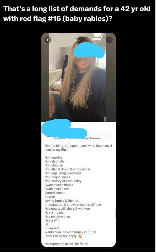 Assuming that's she's telling the truth about her age, which is always a gamble on these apps, she has a pretty long list of wants and no mention of the value she brings. Anyone even remotely in her age bracket that would find her to be cute will have plenty of other options to choose from, with most of them being capable of bearing children. Even if she was forward-thinking enough to freeze her eggs, I'm sure this unicorn man would be happy to pay for the 2-4 times for the IVF necessary for her to become pregnant and all of the other medical complications that go along with it.