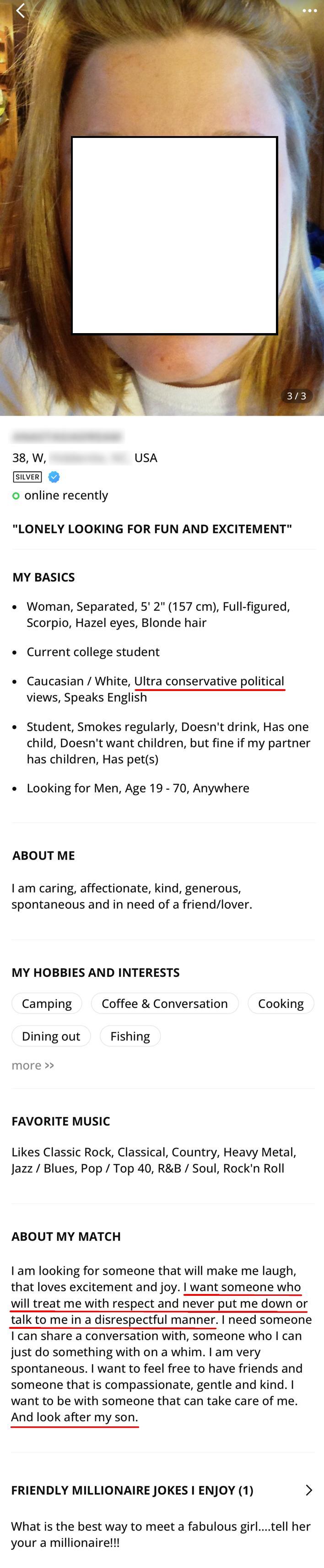 "Full-figured," "Ultra-conservative" single mom seeks father-substitute & provisioner to help raise her son; respectful speech a must