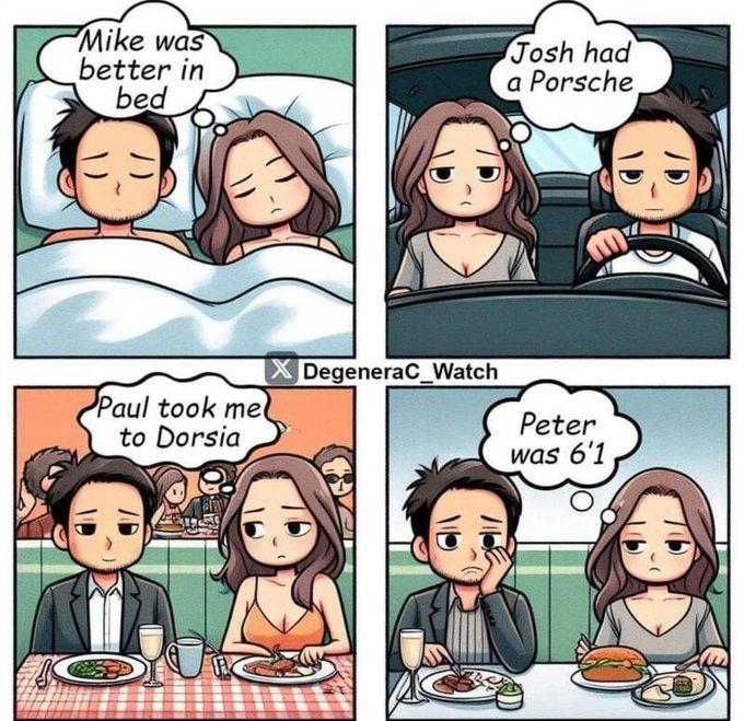 This graphic misses the point: it's not Mike, Josh, Paul or Peter she's missing...its the actual experience of being pumped and dumped. She misses the carousel. She misses the drama of being not knowing where her 'boyfriend' (some guy that for whom she is only a plate) is, who else he is smashing, him not answering the phone, being cheated on etc. Oh the tingles!!!