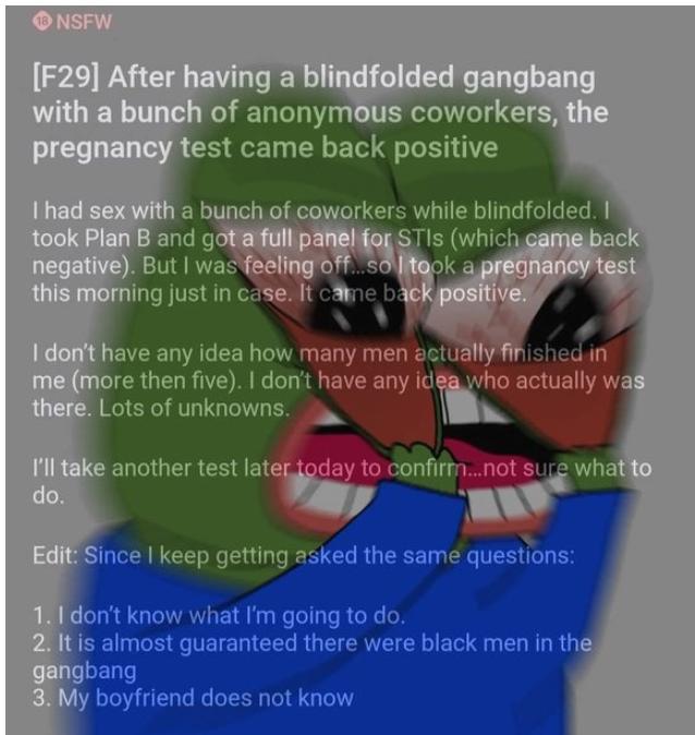 - 4. No brigading, doxxing or witch-hunting. Do not look for the individuals posted here, nor ask or give their personal info/social media, nor ask or give the source or you will be banned and reported to the admins. See here and here.