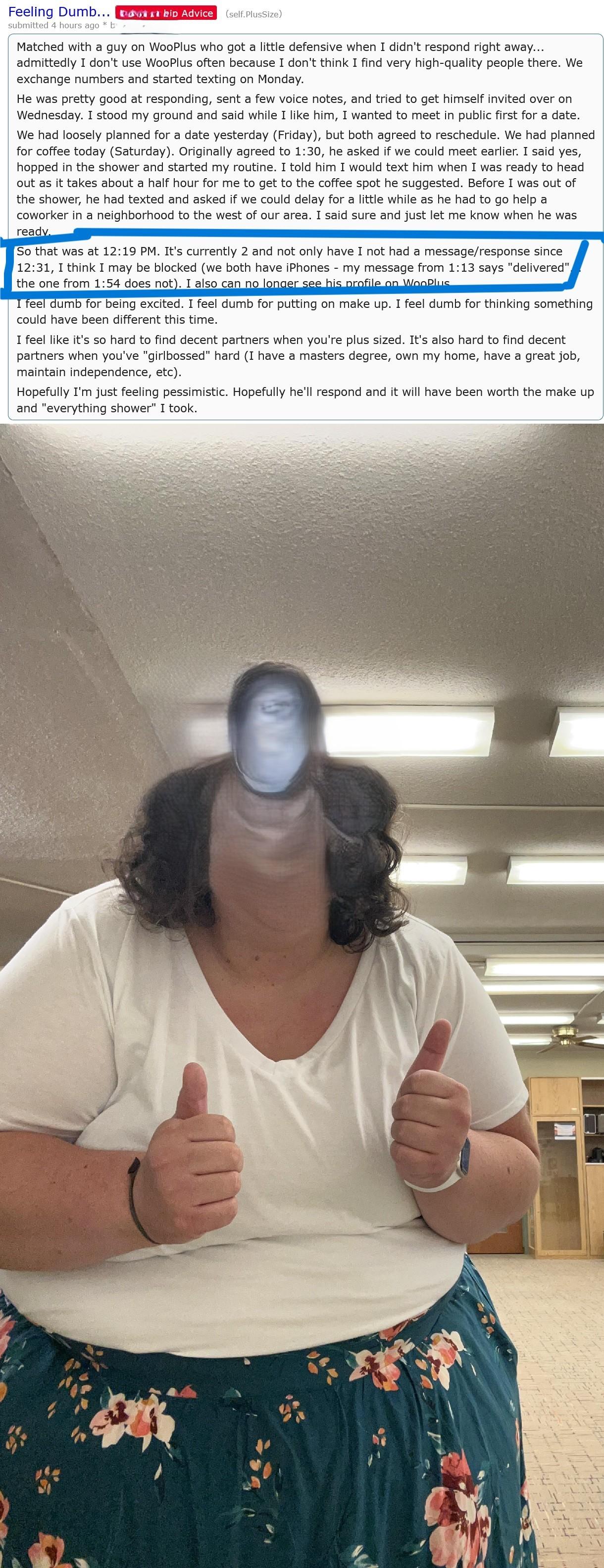 It says a LOT about her that she posts such a frumpy photo and says how tough it is as a "plus" woman to find a "decent partner". We all know here that even a woman such as this can find a "decent" partner, but not necessarily a tall, fit, and financially successful one.