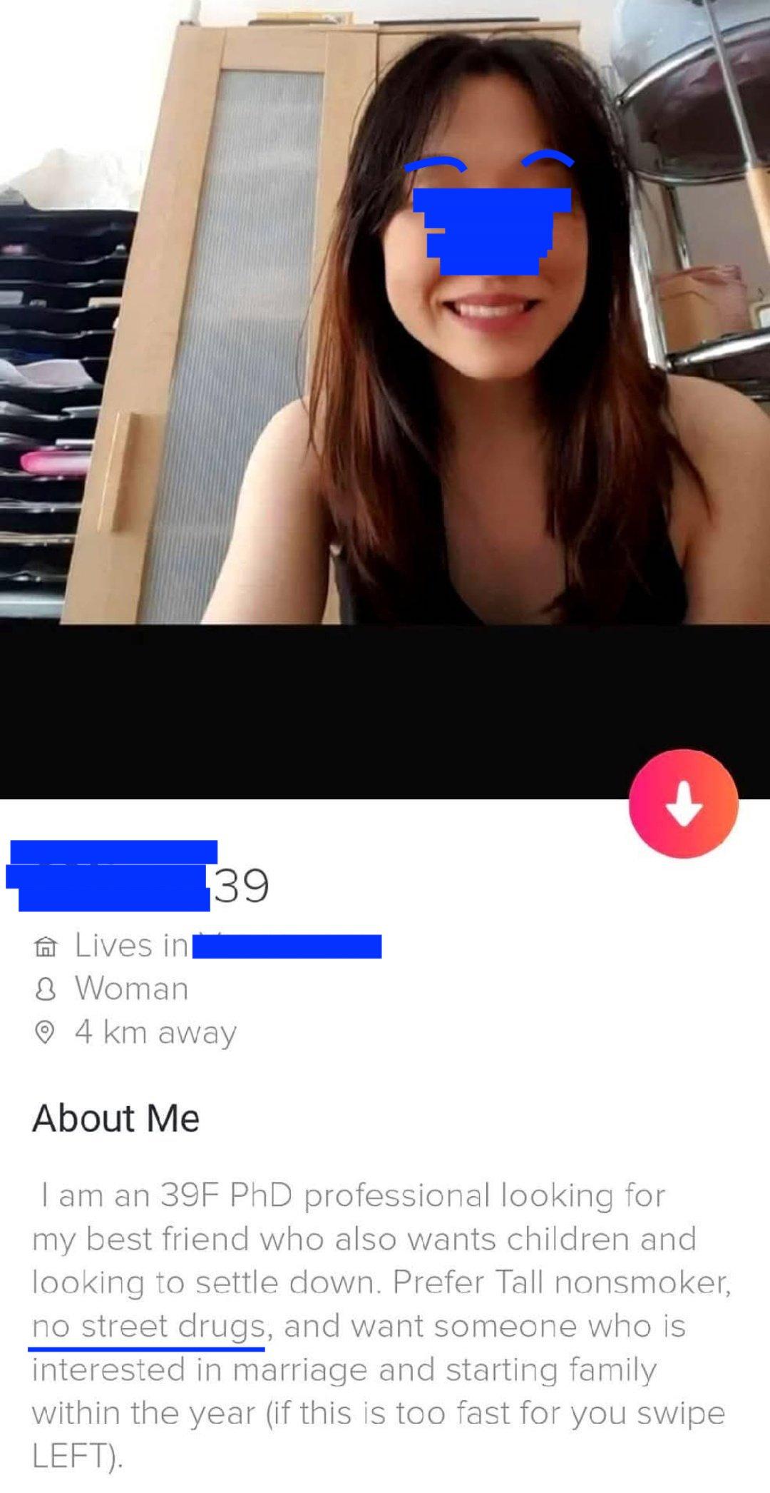 There's the saying that women state in their profiles the kinds of men they've already encountered: She likely has dated tall men who smoked and did (street) drugs despite her having a PhD (did she mention she has a PhD and is a professional?).