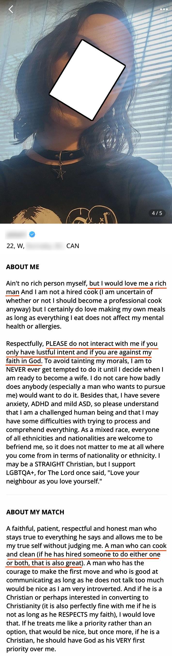 Regarding the religion: She blabs on about that a lot, but regards men as servants, literally to cook for her (after saying she didn't mind cooking her own meals) and to only talk when it's something she wants to hear. She has no intention to be submissive to a husband or to love anyone 1/100th as much as she loves herself. She demands he never judge her for all the flaws she displays as if they are assets but yet he has to be perfect in nearly every way.