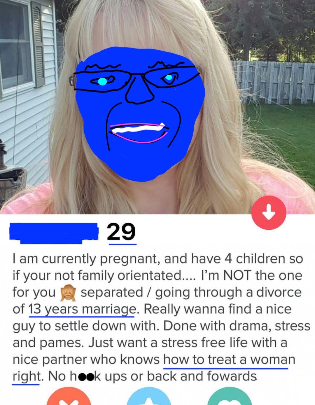 @No-Stress-Cat While I've enjoyed commentary on my art-work, I'd like remark on some amusing aspects of this particular profile: It has all the classic phrases of a bailout/leftover woman: "ready to settle down" (nevermind she was settled down and got divorced!), "done with drama" (She was ok with it before), "treat a woman right" (pay for everything, do house chores, keep his mouth shut) and even dual-mating (pregnant with some guy's kid looking for a man to raise a cuckoo egg).