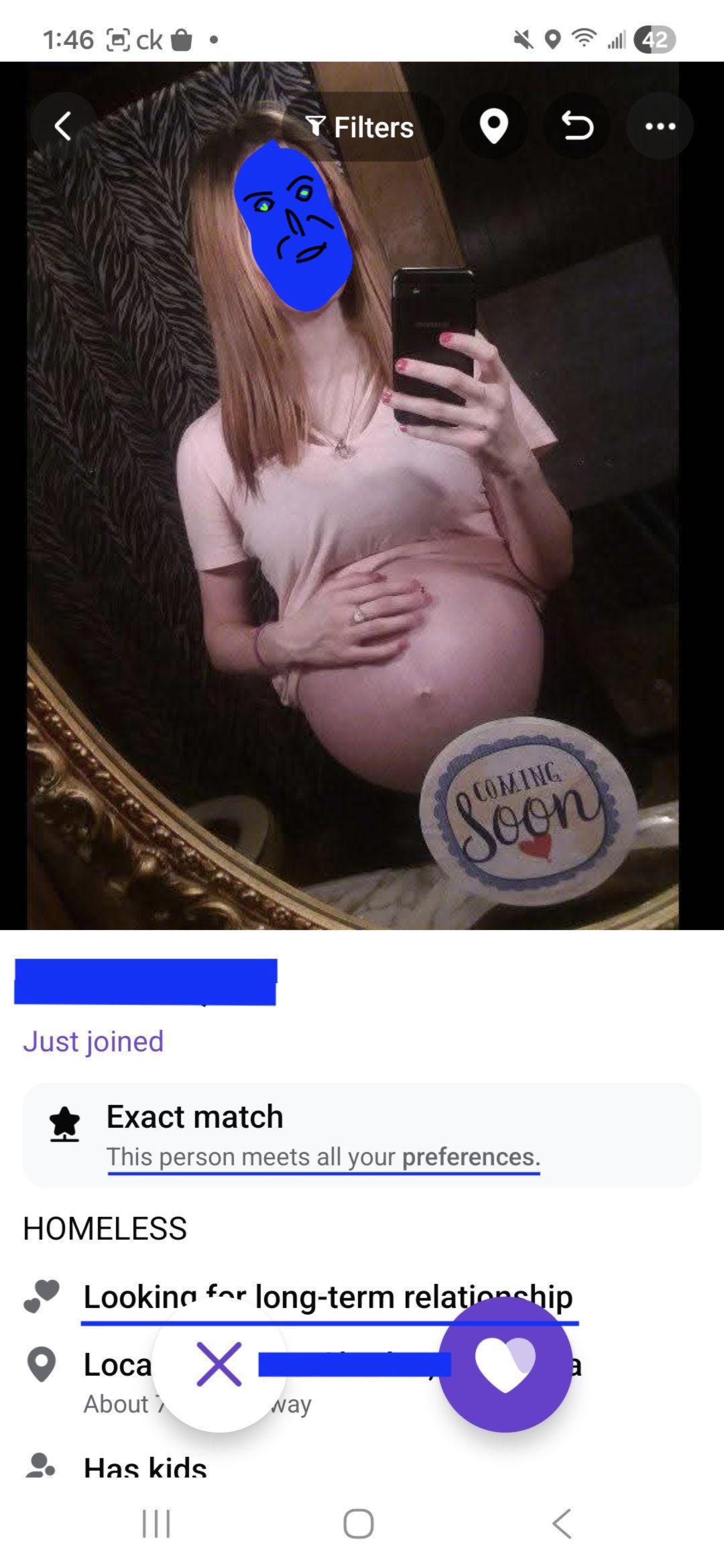 Apparently this app doesn't allow men to select "not pregnant with some other dude's kid" as a preference.