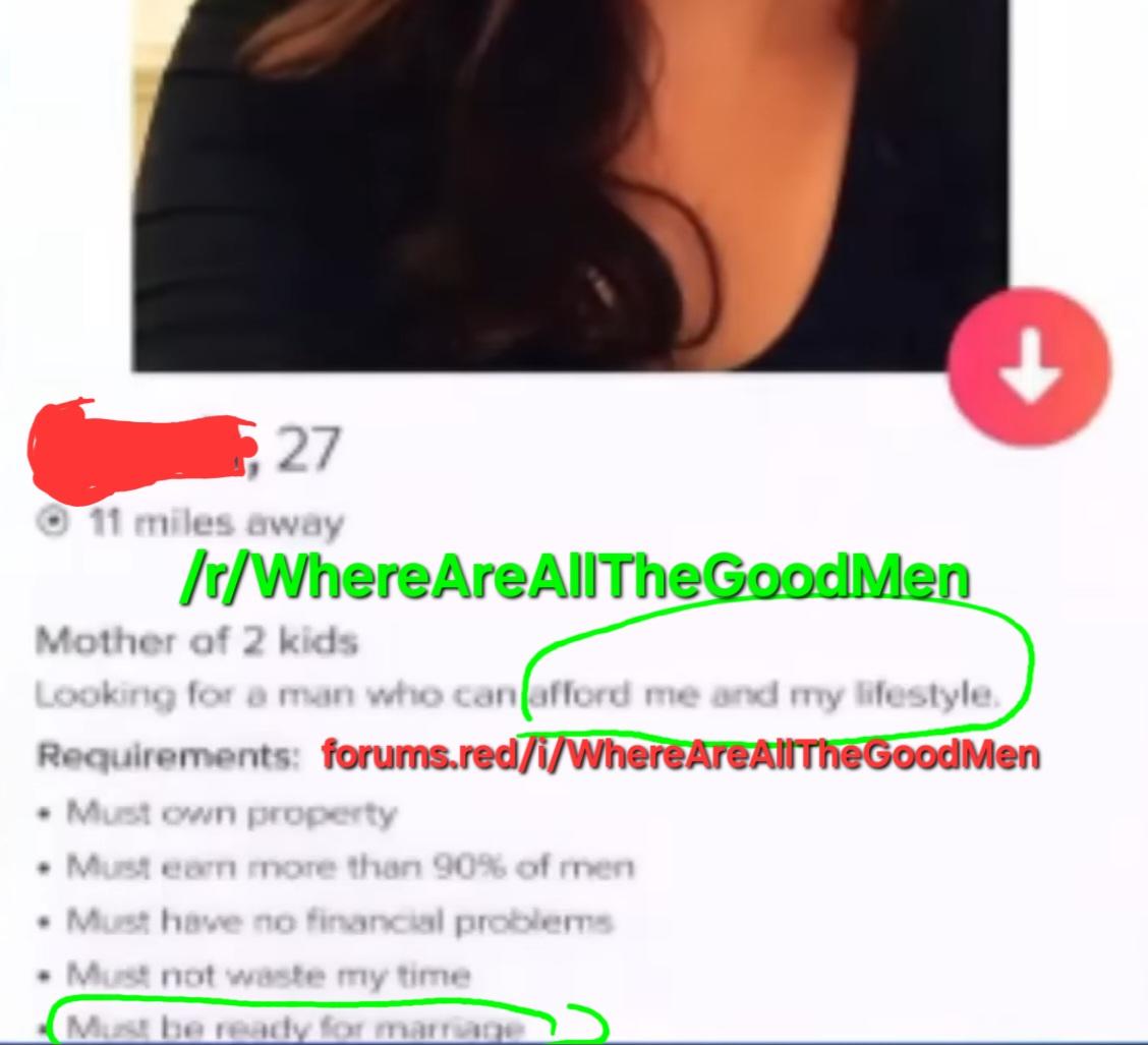 But when she's in her 30s with depreciating looks, jerks who won't commit, the likelihood of being a single mom, and the social pressure from her married friends, she asks "Where have all the good men gone?"[1][2] Funny how back when she was chasing the bad boys "Being nice is the bare minimum", but now that she's past her prime and needs a bailout, she wants a man with nice guy traits.